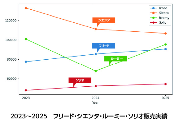 2022年9月を境に、フリードとシエンタの販売台数は拮抗し、10月以降はシエンタが安定して上回る展開となりました。2023年に入るとこの傾向は一時的なものではなく、継続的なトレンドとして定着していきます。