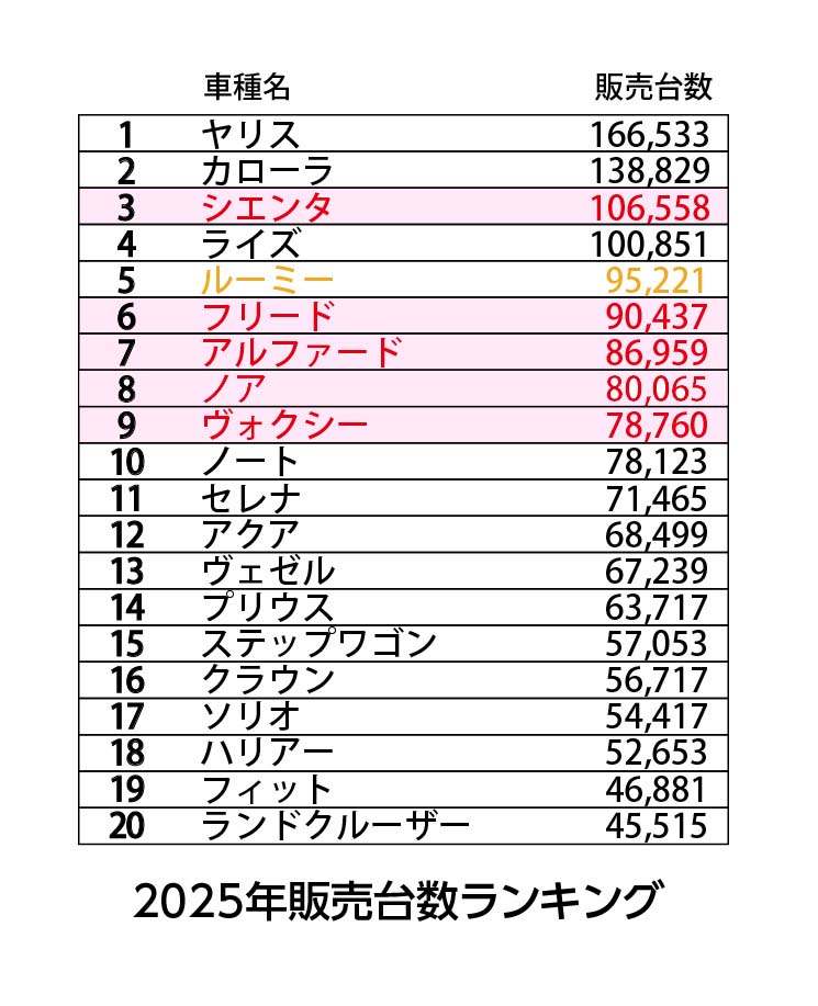 2025年の自販連発表・乗用車販売ランキングを振り返ると、トップ10のうち実に5車種をミニバンが占めています。